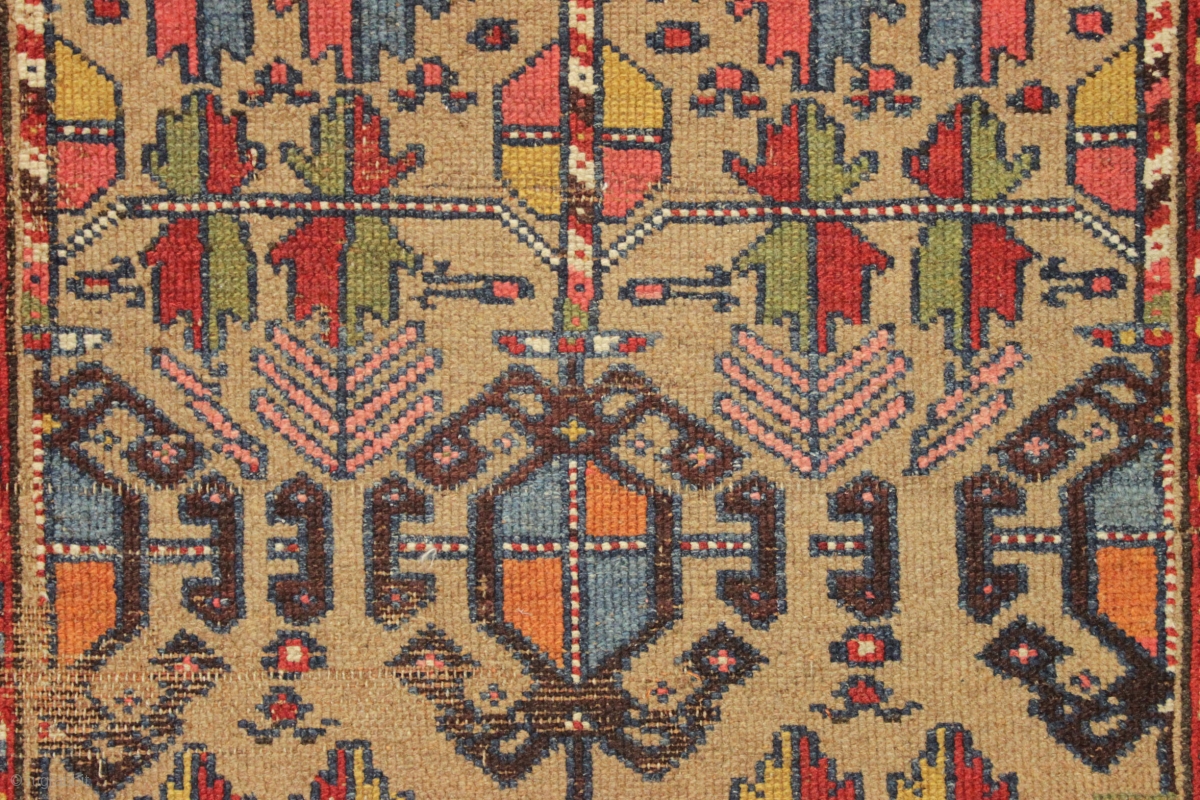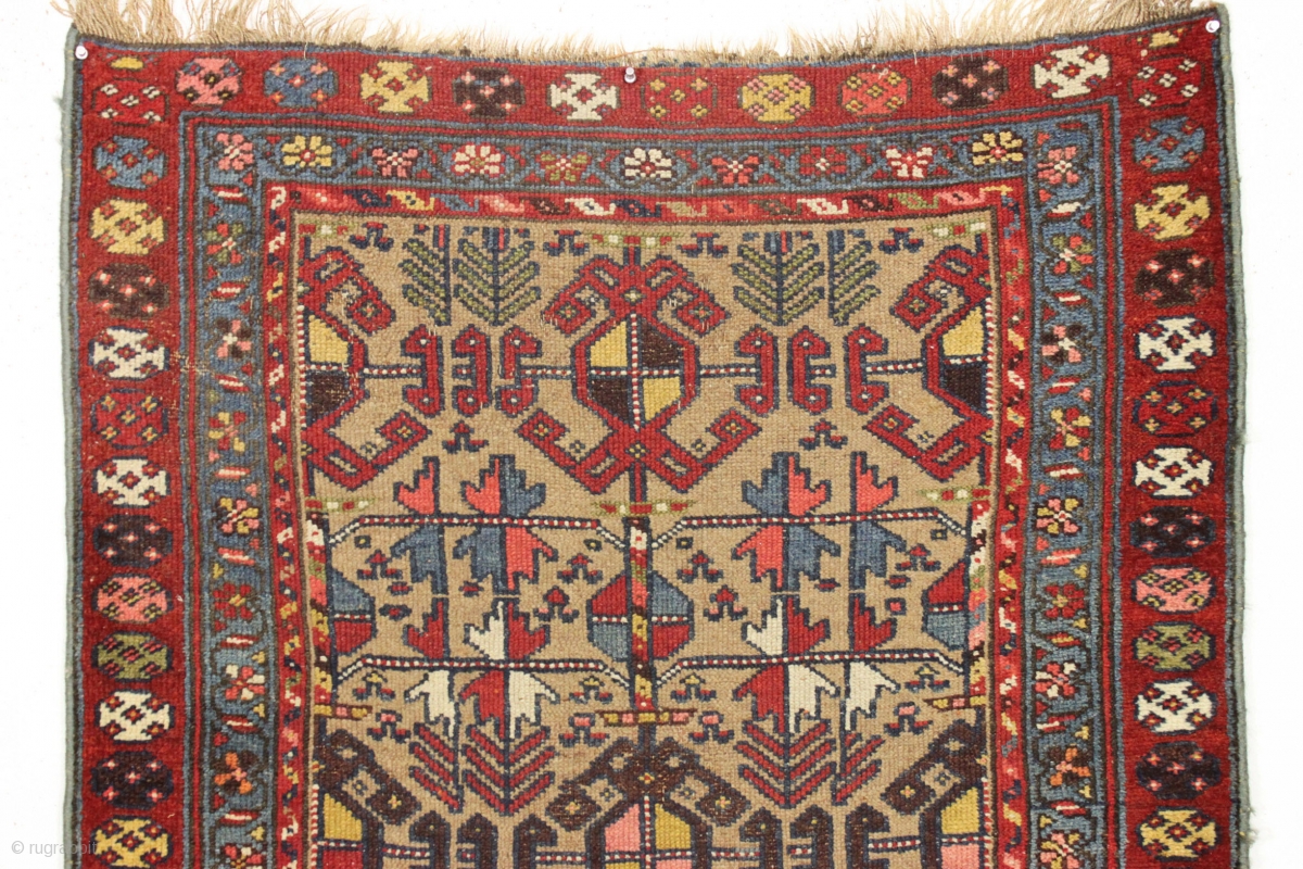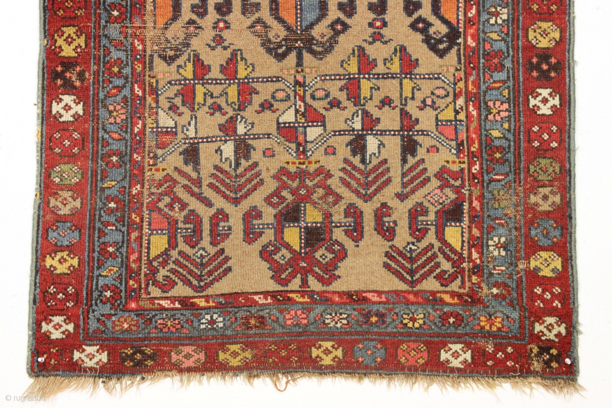 Antique camel ground nw Persian or kurdish rug. Extra colorful version of this known design. "As found" condition, very dirty and with an area of heavy wear as shown. Structurally sound. Good restoration project and priced accordingly. late 19th c. 3'4" x 7'8"