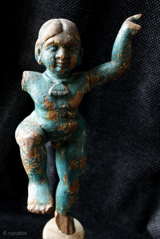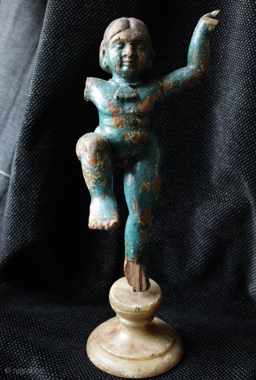 An 18th century carved wood temple figure of the Hindu god Krishna as a boy dancing. Carved, jointed and finished in gesso and blue polychrome. Mounted on an antique turned alabaster base with a Victorian collector’s inventory label on the bottom. From the collection of "an English gentleman." In worn condition as seen in photos with one arm, hand and foot missing. 35cm high including base, 26cm excluding base.