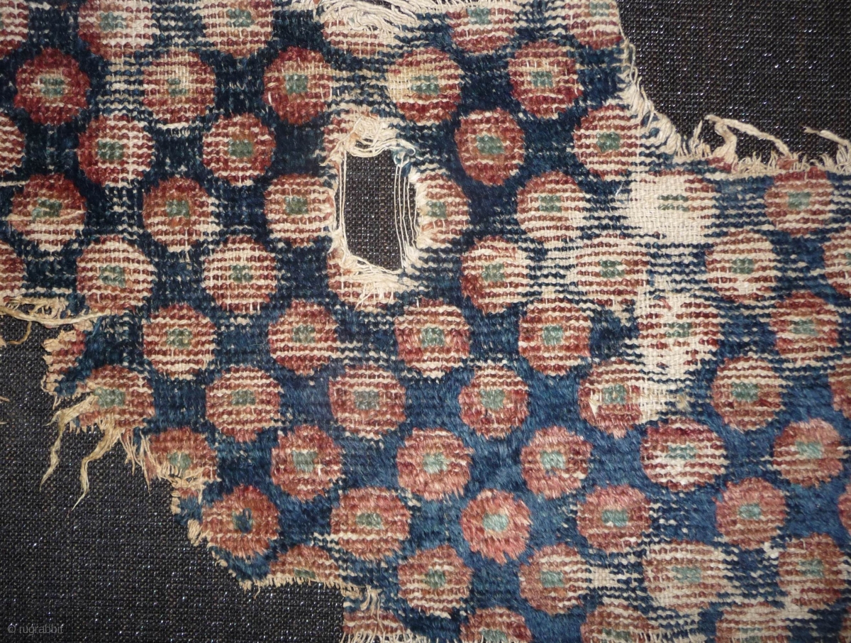 early west china pile fragment with wavy weave and showing the famous central asian pulo design. early rug with this design are rare. some wool weft, approx. 36x 90cm. tiny fragment great charisma!
