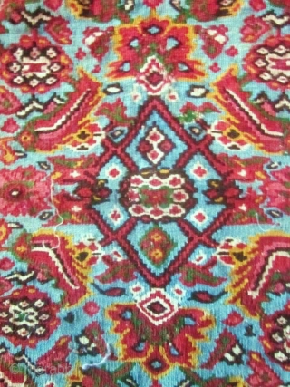 Interesting Kilim Senneh panel of the North western Iran, currently the capital of Kurdistan. Very fine tight weaves made the reputation of these carpets, which the rich intricate designs inspired embroideries and brocades of the Safavid period in Persia. Diamonds, boteh, birds and geometric floral patterns also draw their inspiration directly from Mughal India. Good color and conservation.