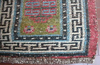 Very old big knot Tibetan "runner", 228 x 66 cm, narrow xix century type, rare green field, bright colors, heavy w&w wool structure, hand-spun wool, very good condition, no repair.