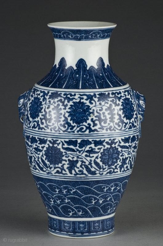a Chinese blue and white porcelain vase depicting lotus blossoms, having two elephant head handles , mark on the bottom. 12.25"h Circa - 19th Century or earlier .