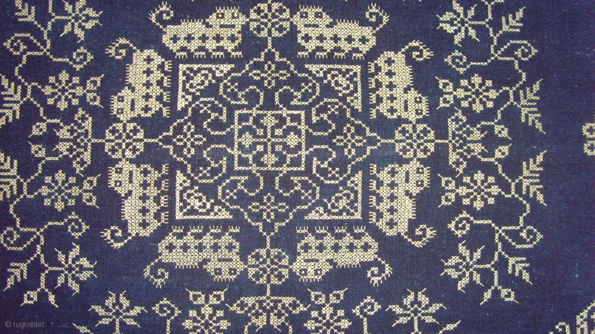 Cross Stitch Silk Embroidery on indigo hand span cotton, on an ivory hemp. 1.27 x 0.58 m. Zhuang, China. Late 19th Century.