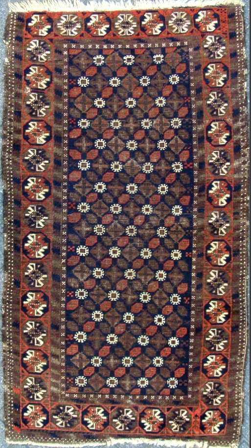An old Baluch with a border design i do not recall ever seeing before. 31 x 55 inches. i would love any feedback.