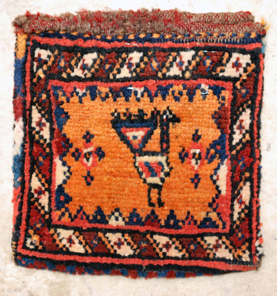 Golden yellow ground Nasrabad double-sided pile chanteh. All wool and all beautifull natural colors this village was famous for. Second quarter 20th c. 20 x 22 cm. a sweet little piece of jewel.