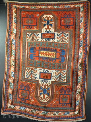 An old Sewen Kazak. Evenly low allover, one or two tiney repairs, good dyes with original ends and sides. Circa 1900