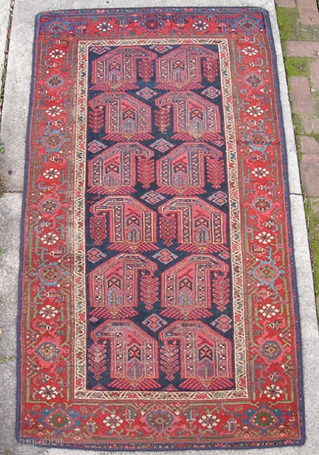 Tribal Rug. 3 ft 6 inches by 6 foot 8 inches. Here is what happens to a handmade antique rug when someone takes it to Becky's Discount Carpet Store for repair work. Sobeit. Nice design and great colors. Some foundation showing here and there.