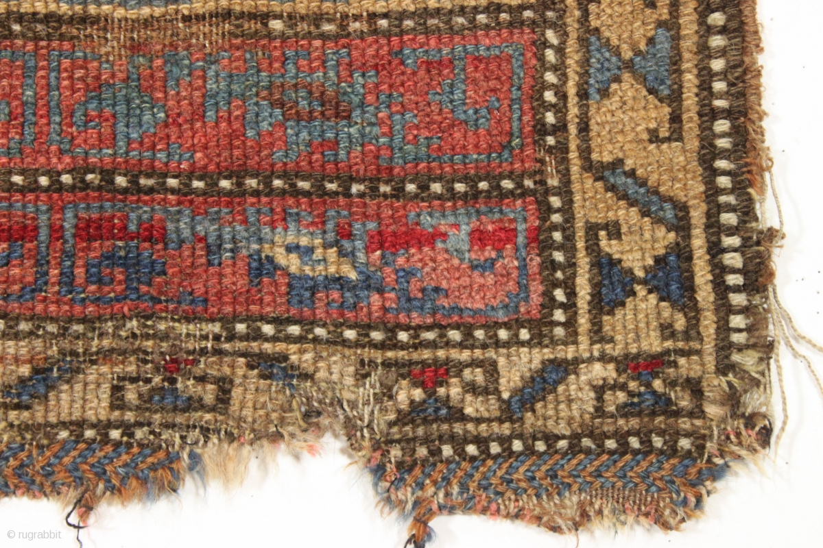 Antique bagface. Probably kurdish. Unusual design. Intersting palette with lots of natural brown wools. Has a certain degree of integrity i like. Nice hole. ca. 1880. 2' x 2' 11"