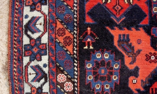 Chicken Afshar 4 ft 10 in x 5 ft 9 inches. 19th century. One of the coolest Afshar designs and i would guess pretty rare as well. One of the things that was hard to catch in the digital photos is that the border is not really ivory but actually light blue. There is a bit of brown oxidation but overall condition is pretty darned good considering age. $20 shipping to us.