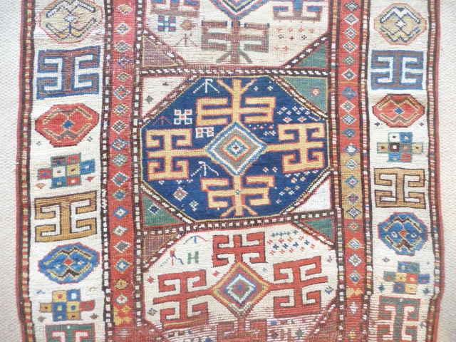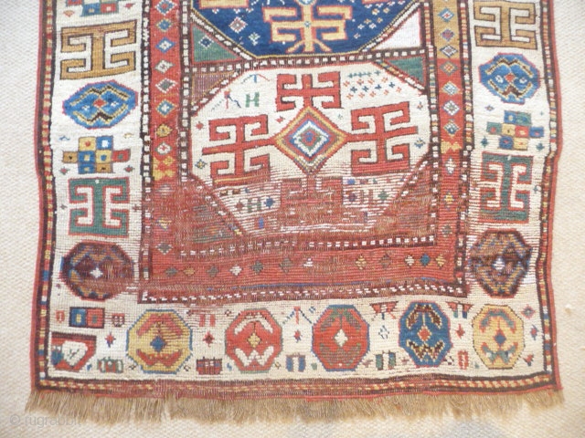 Gorgeous early Kazak long rug,first half 19thcent. lovely colours, old repairs,rebound sidecords, 8ft3in x 3ft4in sold