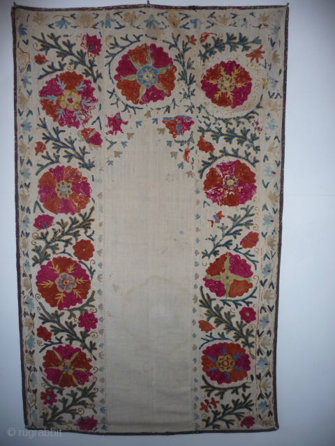 a very pretty small prayer suzani, 4ft5in x 2ft9in.,late 19th cent., embroidery a little rubbed at the top,slight run from the cochineal in a couple of flowers, sound with attractive printed backing,water stain hence ridiculously low price,