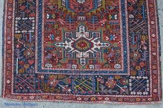 Karaja. 3 ft 7 inches by 4 ft 6 inches. Another decorative March madness special with colors. Light glue on the ends but the rug has been properly stabilized with needle and thread so it isn't all that stiff. The sides are original with a little bit of repair here and there. The ends are a little off square but i have seen a lot worse. Small repair on one corner shows ok. Nice even pile. a real pretty rug and good size. $20 to ship in the us.
