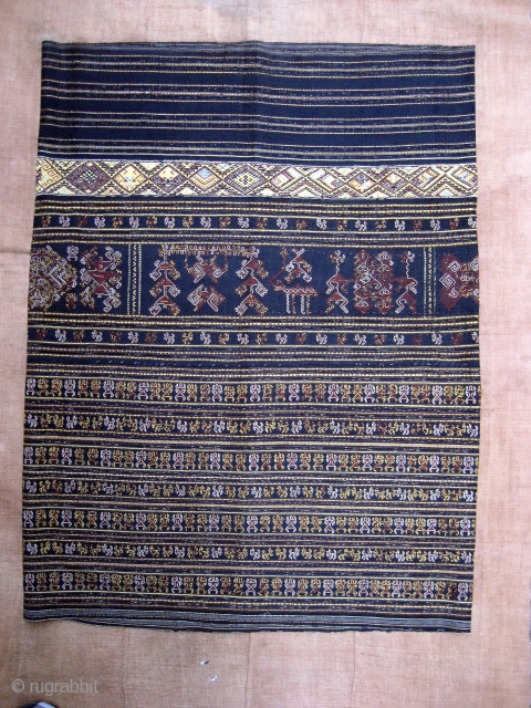 -ha li minority,hainan island south china,womans wedding skirt,silk embroidery on cotton with a silk supplementary weft woven decorative band. totems include human ancestor figures and a wedding procession.--this piece is estimated at being in the region of 60-70 years.-skirts of this type are now very rare, and the li people no longer produce such magnificent work.-