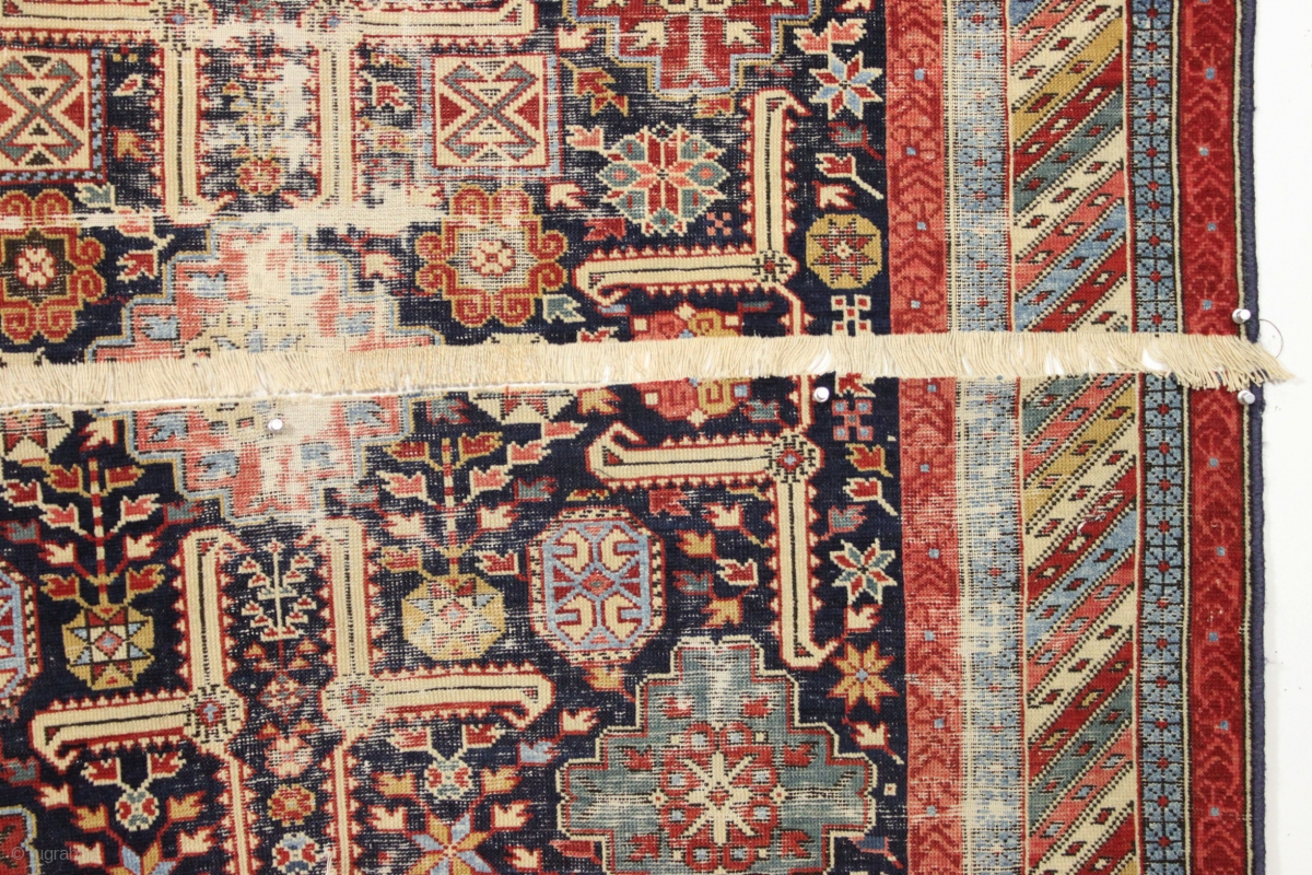 Strange remnant of an old shirvan rug with large areas of light blue cotton pile including most of the minor borders. Never seen anything quite like it before. Bad person cut rug. Very little missing. as shown 4'3" x 6'4"