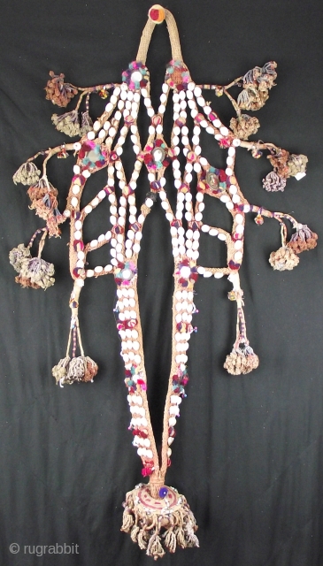 Decorative rope camel trapping, this vintage piece is embellished with shells, mirrors and tassels with a large central fringed rope pom pom.