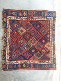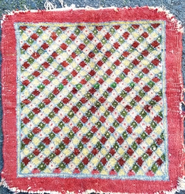 • Persian Pushti- about 17" x 17". Interesting grid pattern with outer plain band. Wonderful color and mostly good pile. Ends/side unravelling ... read more