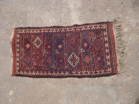 • Small Qashqai Rug with blue ground and nice design,old repairs done.Size 3'10"*1'10".E.mail for more info and pics.