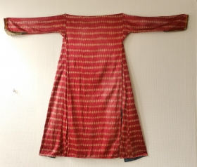 • Ottoman silk ikat coat for women, Aleppo ikat with metal thread on the board and sleeves. Good condition, beautiful rich red color,lining indigo ... read more