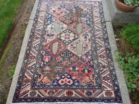 • Strange old Bakhtiari garden rug with very funky transitional dyes: 54" x 80" sold.