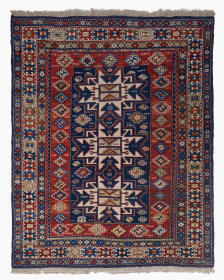 This third quarter 19th century Kazak Oriental rug #8199 measures 4‘3“ by 6‘5“. It has three Shirvan stars in the center, one ... read more
