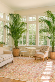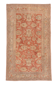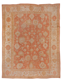 This grand antique Oushak rug from Western Anatolia features a luminous terracotta field adorned with large-scale floral and palmette motifs in soft ... read more