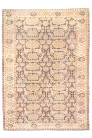 This magnificent antique Oushak rug showcases a highly decorative repeating lattice motif, executed in a refined palette of soft taupe, ivory, muted ... read more