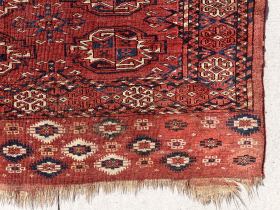 The pile of turkman bags is dangerously high. Older large yomud or kizil Chuval in rough condition but it has a skirt ... read more