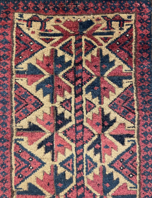 Lovely early fine Baluch rug. Just acquired locally. Attractive blue ground memling gul design. Delicate turkman line border. Decent condition for the ... read more