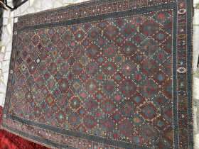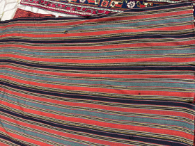 East Anatolian Kurdish divan cover. Red-wefted group with great color including slate blues and greens, salmon, and good. fragmented into three pieces, ... read more