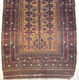 Tibetan small rug or saddle top with a camel ground, abrashed blue vine-scroll and a red central quatrefoil medallion. Nice auspicious bat-like ... read more