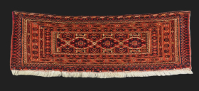 Antique Tekke or Saryk Turkmen torba of very fine weave, with 'kedjebe' design. Circa 1870. Size: 3ft 6in x 1ft 3in (107 x 38cm) ... read more