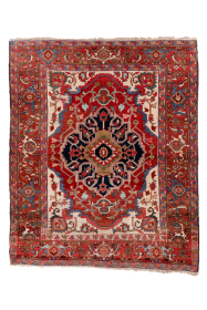 Antique Persian Serapi Rug, circa 1900. Featuring a bold geometric medallion on an ivory field with rich red and deep indigo accents, ... read more