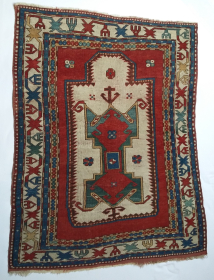 Kazak Frog rug Known as Lori Pampak and sometimes attributed to the Fachralo village. The dimensions are: cm 140h, width 107 at the top ... read more