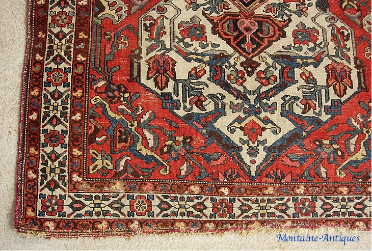 Antique Malayer --4 ft 5 inches by 6 ft. 6 inches. Really nice single weft classic Feraghan type ivory medallion with lots of reds. That's why i called it a Malayer. But I'm not so sure it isn't an antique Chahar Mahal Bahktiari. Whatever. It is what it is. Bright and Pretty and goes real well with antiques.