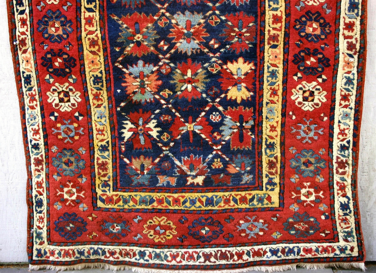 Antique Saliani Gallery Rug / s.e. Caucuses / Circa 1850. Exceptional wool and dyes. DeeP full Pile, original ends and sides with minor restoration of selvedges. Several small areas of re-piling in lower border, perhaps due to moth damage? The rug has very high original pile throughout and is in amazing condition for it's age. Cotton wefted with a well executed weave indicating a high level of skill. Much of the camel color in the "wing", (or flower, if you will), motifs is natural camel hair yarn. Though not an unusual or rare design, these rugs are so much more vibrant and original than your standard run-of-the -mill Kazaks being "produced" not so far away in the same time period!