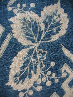 asa katazome noren, Japan, Meiji (circa 1880), cm 147x60. ‘Asa’ is akin of linen, and is the general term used in Japan for bast fiber cloths woven from plants such as ramie, hemp, linden, wisteria, nettle, kudzu, etc. The object we are offering here is a splendid Meiji-era noren (curtain) obtained by partially joining two lengths of an hemp asa fabric. It features a very fine katazome (stencil-dyed) pattern of ‘kiri’ (paulownia) leaves with sprays of blossoms, running up and down the length. These alternate with ‘sayagata’ (swastika, sometimes called also "monk's maze") motifs, first imported into Japan from India via China on the silk road during the Asuka period (6th-7th century). Other than some overall gentle fading, the fabric is in outstanding condition, with no significant holes or stains; the hemp asa is hand-plied and hand-woven, and the indigo of is course botanical. a wonderful textiles that incorporates much from the soul of Japanese art’s ‘Weltanschauung’.