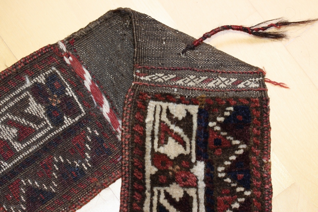 Baluch trapping; probably Timuri; around 1900; very good condition, very precisely knotted with a clear motive you find as main border in bags too, lot of small details – see how the weaver made sides, or the small stripes made in “weft float technique” in the middle of the band… a similar piece you can find in d. Sorgado "Baluch" pl. 100