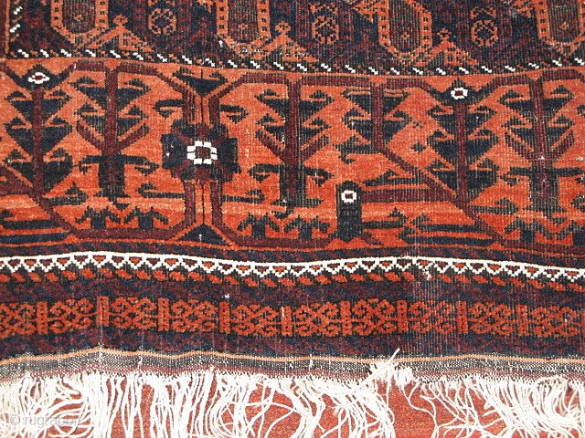 Belouch Boteh rug. What a beauty. In pretty good shape with a couple of holes along the selvage and one 4" section of selvage and outer boarder missing and some oxidation in the field. 3'x6' Offered by Chris of Nomad Rugs in San Francisco. www.nomadrugs.com Thanks for looking!