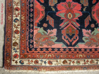 Blue field Mehriban mossul, 3.7 x 6.3 early 20th cent. Lovely soft colors; all natural dyes with subtle abrashes. Wonderful uncluttered design with deco appeal. Sides are recast; missing a bit on both ends. Generally even pile with a few areas close to foundation. $20 us shipping.