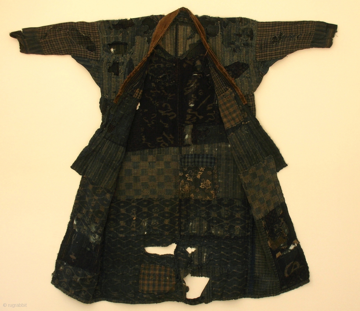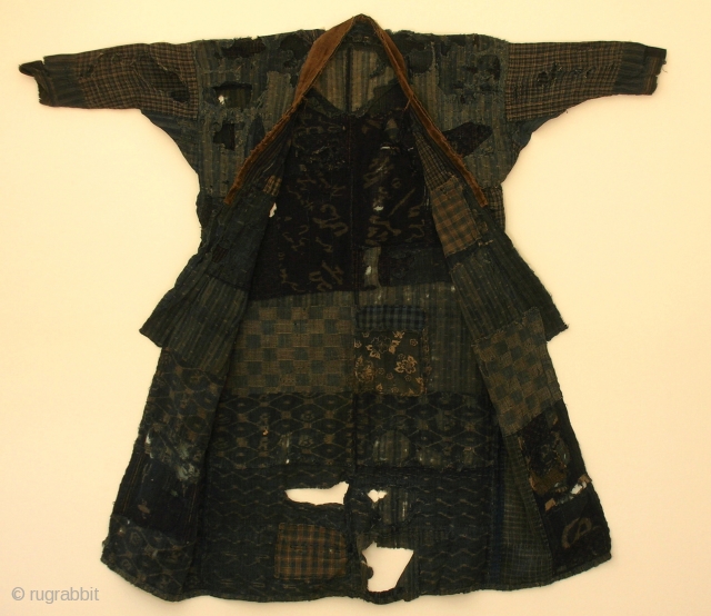 boro noragi, Japan, late Meiji (circa 1900), cm 117x123. This is a very incredible noragi (work coat) made of recycled indigo dyed cottons; in other words it is a ‘boro’ jacket that was definitively worn for work. The beauty of this noragi resides in the amazing mending to this coat. Both the exterior and the interior parts of coat’s body are mostly made of rustic hand loomed, indigo ‘e-gasuri’ (double ikat) cottons, richly patched and mended in layers via ‘sashiko’ stitchings to provide extra strength against the wear of burden that was being carried. Nonetheless, this noragi had clearly undergone a robust distress during time, as shown by the plenty of holes and tears, but this only adds to the magic of it, i think… i particularly like the fact that owner tried to add bit of extra fashion flair to this humble item by stitching a brown velour lapel on it! a truly great thing at a little price. For passionate people only.