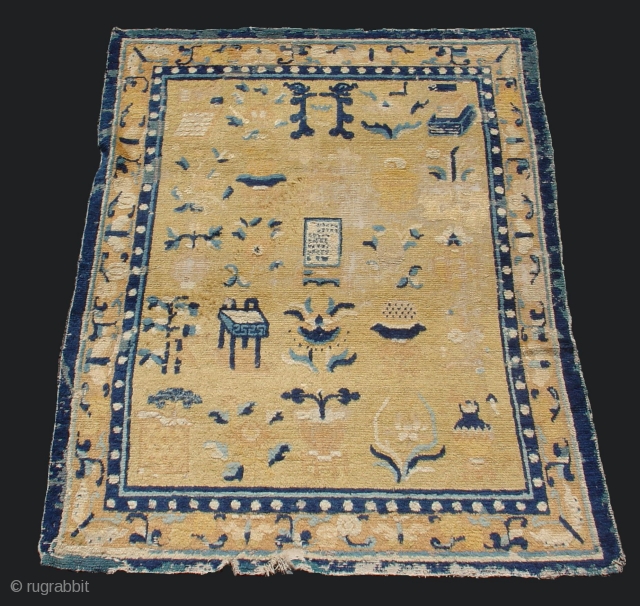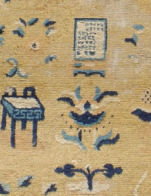 Chinese Ningxia Scholar's Rug with dragons, an inscribed tablet, incense burner, plants, ceramics and other symbolic accoutriments. First half of the 18th century. scattered antique repairs. 4'6" x 6'5" , inv#5653_S