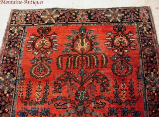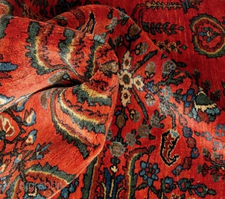a different kinda Sarouk, 4'6" x 3'2" early 20th Cent. Open, almost tribal design. Unique border for a Sarouk. Good saturated natural colors; lucky ducky: escaped painting. Fine weave. Full thick pile. Supple. Amazing quirk wool-- gotta touch it. This is a great rug to stand on barefooted and wiggle your toes.