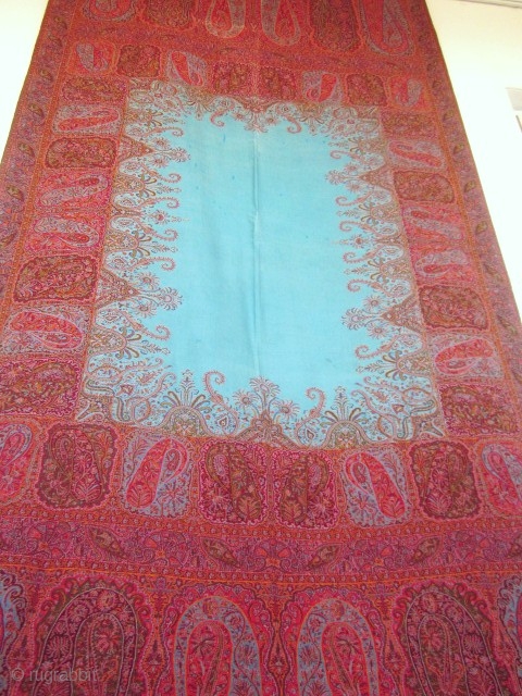 No woven signature, but the french shawls were never signed during this period. Surely a great parisian shawl maker. Four tiny invisible professional mending in the reserve (less than 1 cm) very well done probably at that time. a dozen tiny spots slightly darker (splash?) In the blue reserve, otherwise the shawl is in very good condition (see photos).