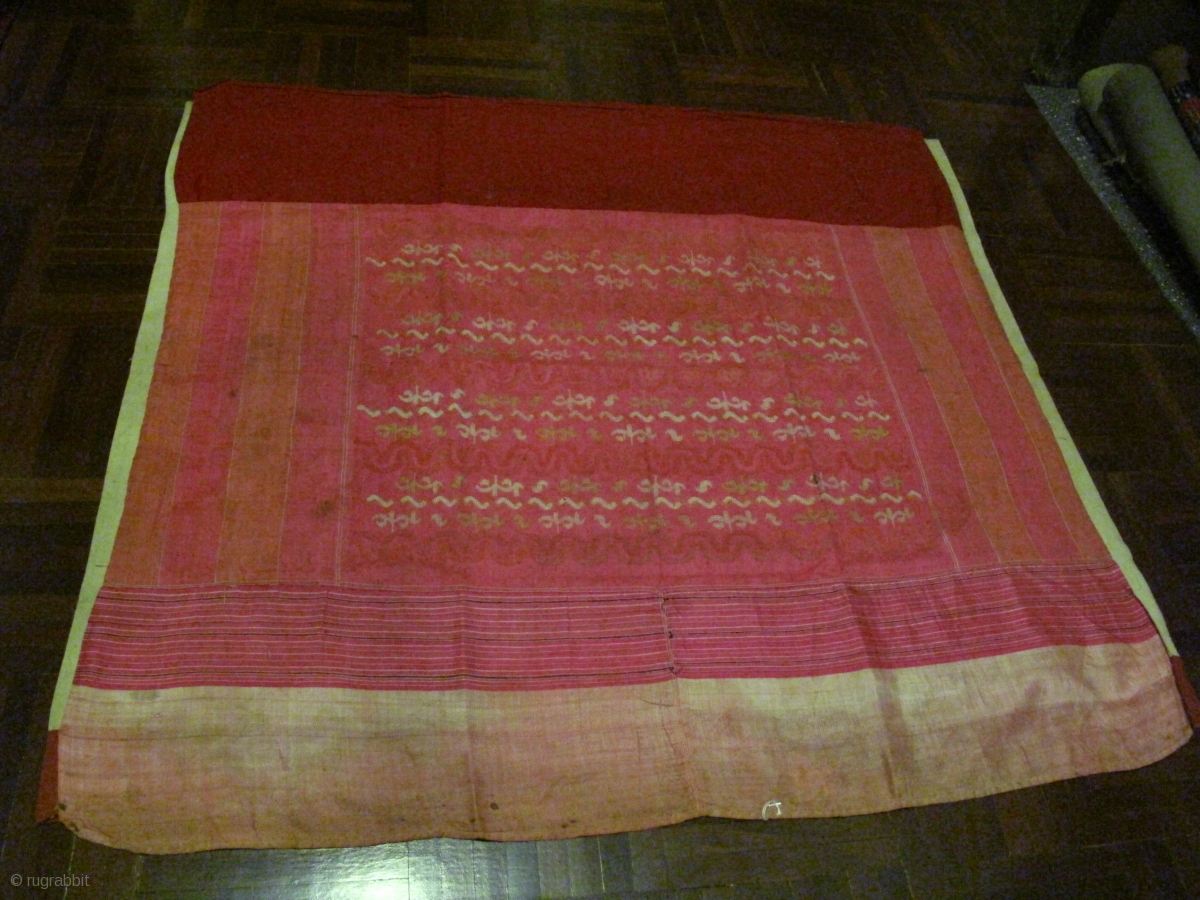 Hta-mein : traditional Burmese Luntaya Acheiq (100 Shuttles interlocking tapastry weave technique) wrap around skirt for a girl. Bright pink color is now sombre nicely with age. Silk with cotton waist band and lining. Excellent condition with original lining. No color running at all. It is rare to have come across the piece for small children such as this one. As this type of textile is highly prized, the owner was definitely born into a wealthy family.