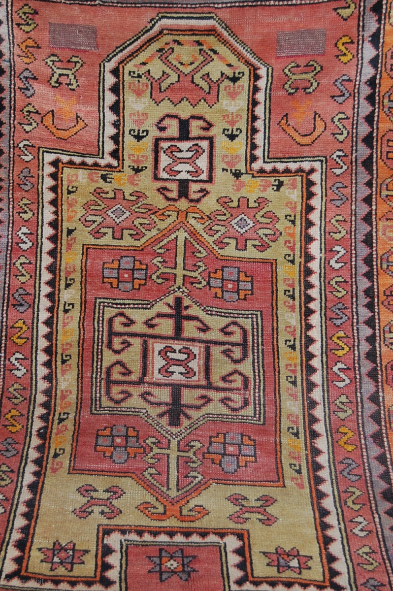 Old kars Kazak region carpet, velvet on wool, beautiful kazak, very good condition apart that there was a signature which was taken away, as it was used as a prayer rug, size is 165/110, synthetic colors