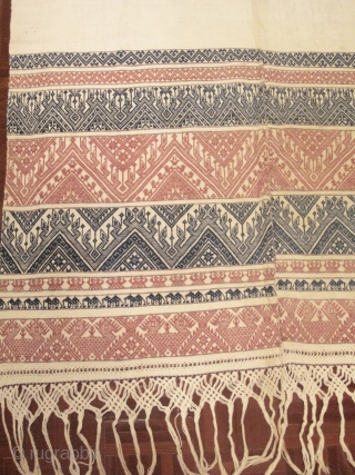 "Pah Lop" a Tai Lue mattress cover cloth from Udomxay, Laos. It is made from two long panels of hand spun cotton sewn together forming a big 1m. x 2m. big rectangle piece of cloth. About 1/3 of the piece is decorated with continuous supplementary weft work in various abstract and animal motifs. All natural dye (deep indigo and maroon. The piece terminates at the end with lovely macrame warp work. Estd. age : 60-80 years old. Nice piece for ethnographic collecting purpose !