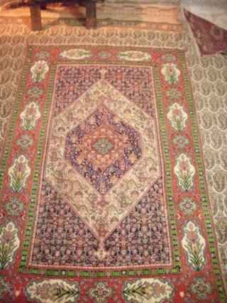 Senneh Rug,wool on silk base,beautiful colours,excellent condition and desigen,without any repair,Thin and soft like cloth.Metal rings for hanging on back.Size 6'9"*4'4".