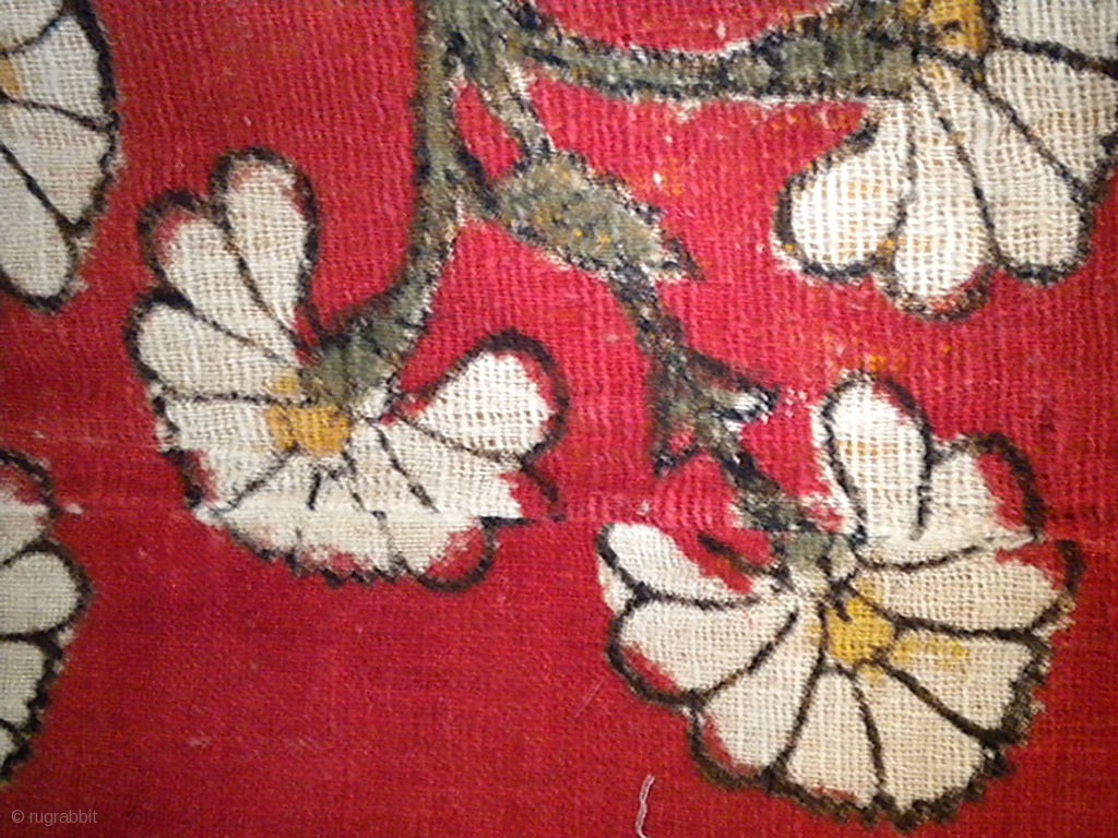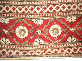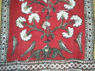 this tapestry shows the late return of the Mughal period design that was popular in the eighteenth century. There is a typical mughal tree of life under a central mihrab and several smaller harlequin arches and little birds in shades of green yellow, green, tan, red and black (vegetal dye). Fully lined with cotton satin orange. Very good condition.