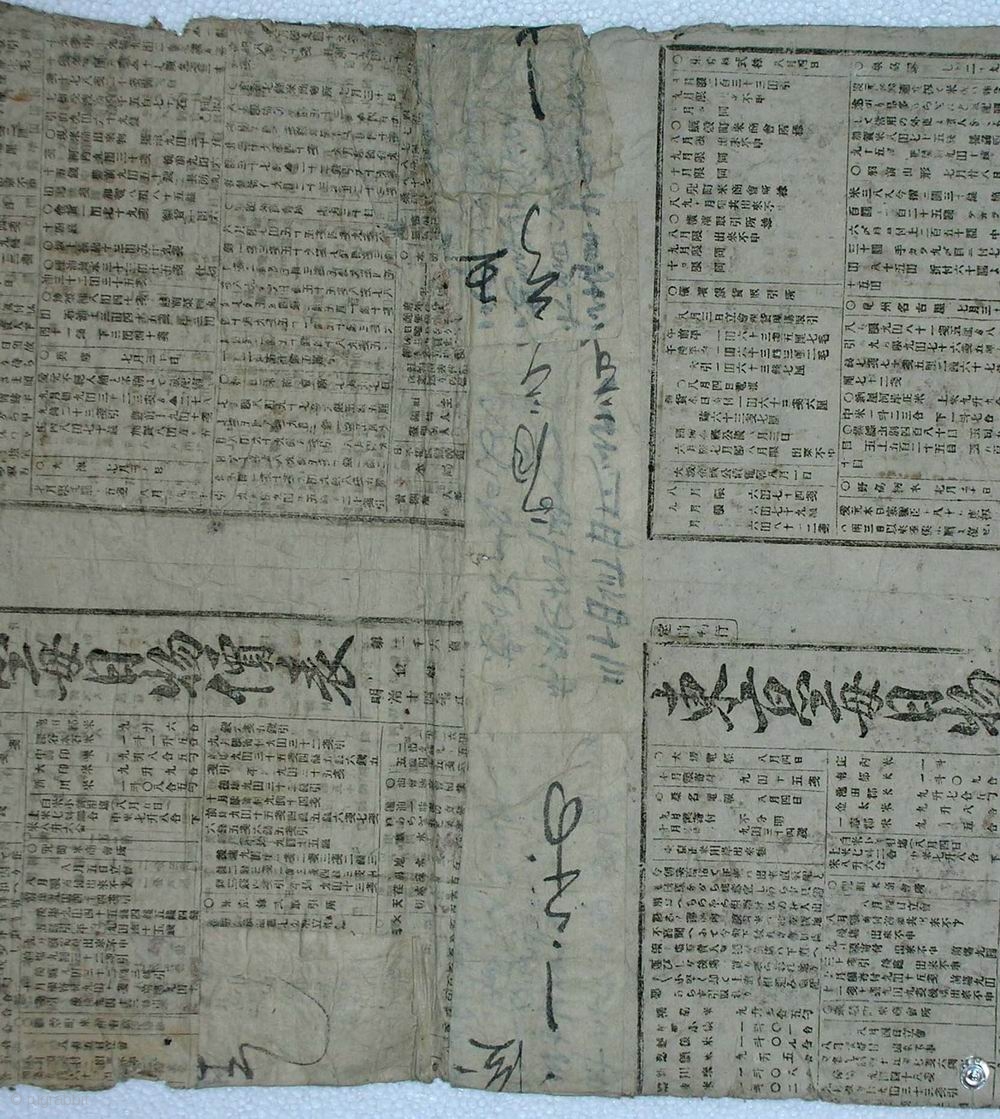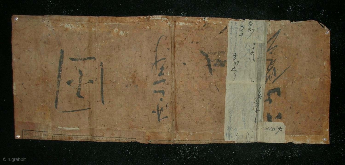 Tatoshi 4, Japan, late Edo (first half 19th century), cm 82x33. These remarkable pieces of patched and pasted papers (in a sort of boro-way) are called tatoshi. They are a marvellous collage of pieces of recycled hand-made paper, and sometimes newspapers for the back, which were painstakingly - yet haphazardly - glued together to obtain sort of a durable medium, as tatoshi were used in a pawn shops to wrap goods, probably kimonos . The brown tone on the paper is from the ubiquitous kakishibu, or the tannin extracted from green persimmons. Kakishibu is found on all manner of Japanese utilitarian goods as it adds durability to the fibre it saturates. By examining the calligraphy drawn on many of the papers, we have seen scrawls which bear dates from the early to mid 19th century, so they were clearly part of everyday’s life at the end of Japan's Edo Period. The wonderful texture of each individual piece is hard to represent with photos… we will try though. What we cannot show is their great ‘tactile’ feeling. a very Japanese object, with a great visual quality. Almost a contemporary works of art.