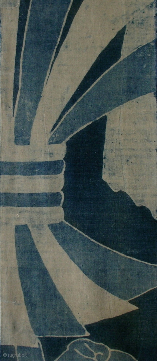 Tsutsugaki ‘noshi’ futonji panel, Japan, Meiji (circa 1880), cm 131x33. This is a really lovely panel from a bedding cloth (futonji), decorated in the so-called ‘tsutsugaki’ technique with the pattern of a ‘noshi’ in different tones of indigo and white. Noshi are a kind of ceremonial origami (consisting of white paper folded with a strip of abalone, considered a token of good fortune) that are attached to gifts to express “good wishes”. The cotton is hand spun and hand woven, the design rendering is beautifully clear and the different shades of indigo colour have very nicely faded over time. The cloth has just the right amount of wear; it still embodies the soulful, old Japanese feeling without being worn-out or sad from too much age. All in all, an intriguing length of indigo dyed cotton where the single patch at one side (see pictures of front and reverse) adds a striking touch to this otherwise very fine piece. Great graphic seen thru the lens of age. Much recommended.